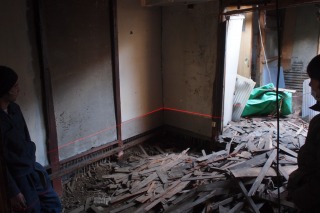 座敷と台所の間の三枚壁がズコッと落ちてるのだが、壁が重すぎて柱が揚がらないとのこと。
