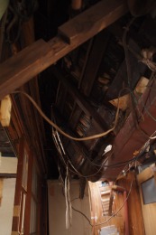 落ちかけの土壁の隙間から、小屋裏でさっきの屋根のくぼみの原因を発見!!
