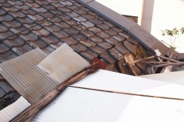 晴れの日を狙って、まずは雨漏りでグサグサの屋根を直します。